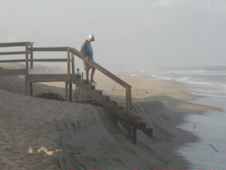 Vic traveled down the beach a few days ago and saw a cliff forming where the ocean was eroding a man-made dune. A day later he went back and saw that, where an NPS vehicle had been able to drive past a staircase the day before, it could no longer. There wasn't enough room in front of the staircase.Now the staircase is unusable, and parts of the beach are inaccessible. This all in the space of three days—and the full moon isn't until tomorrow.